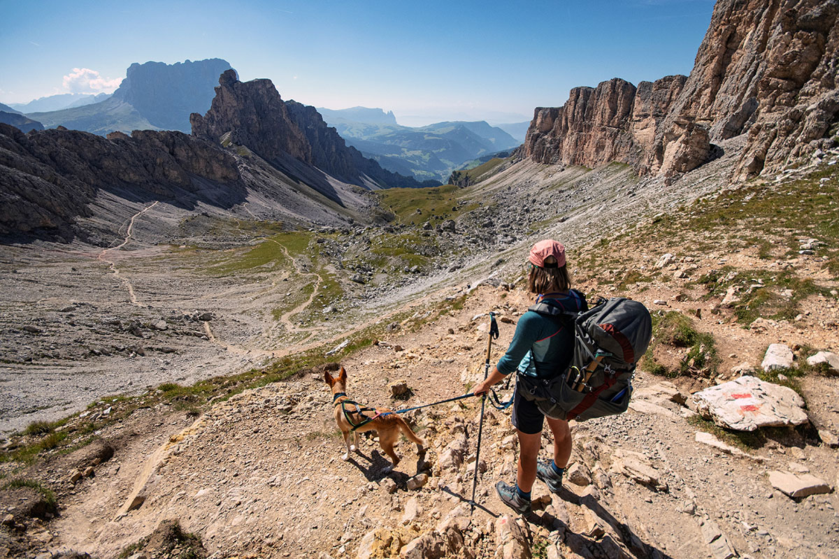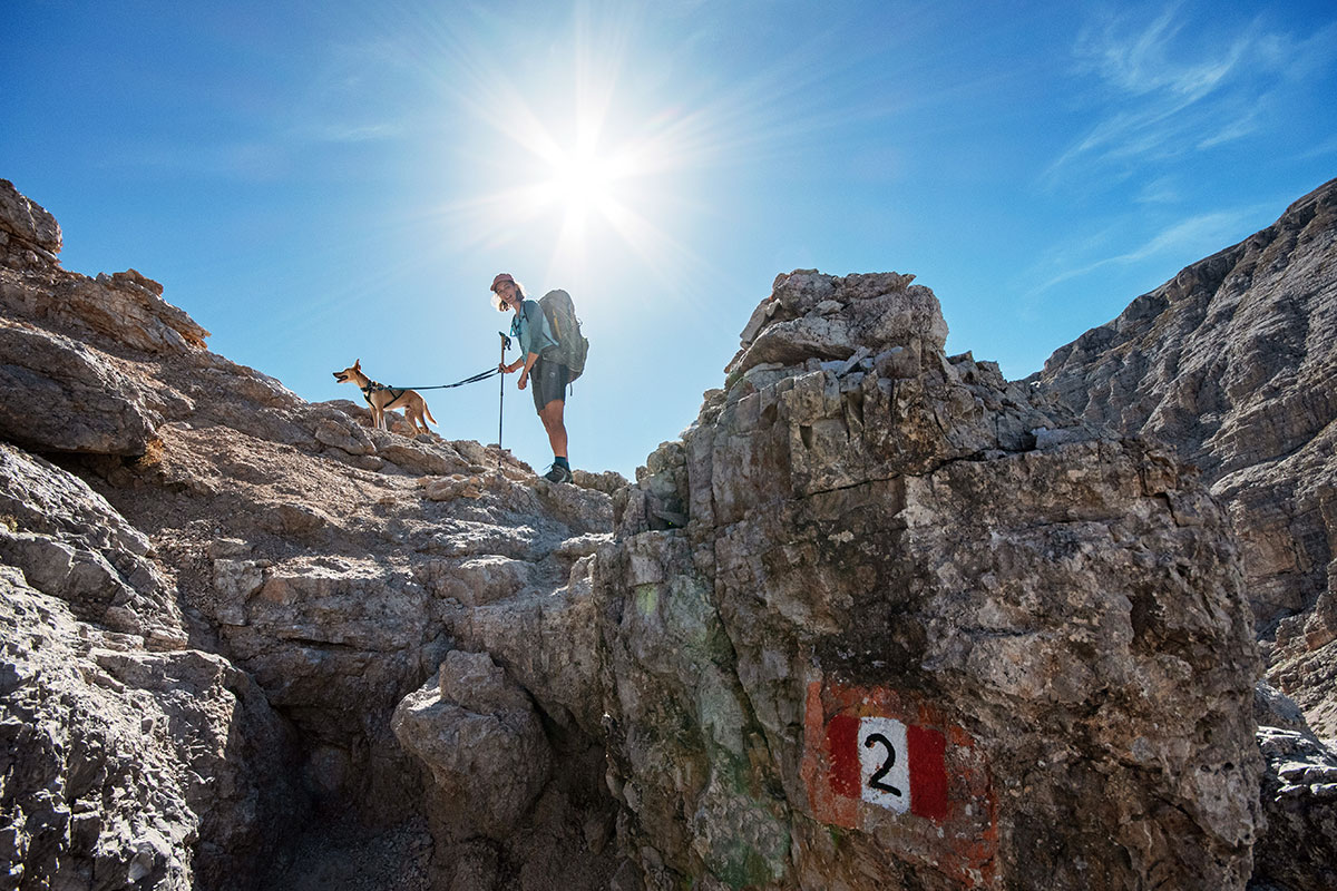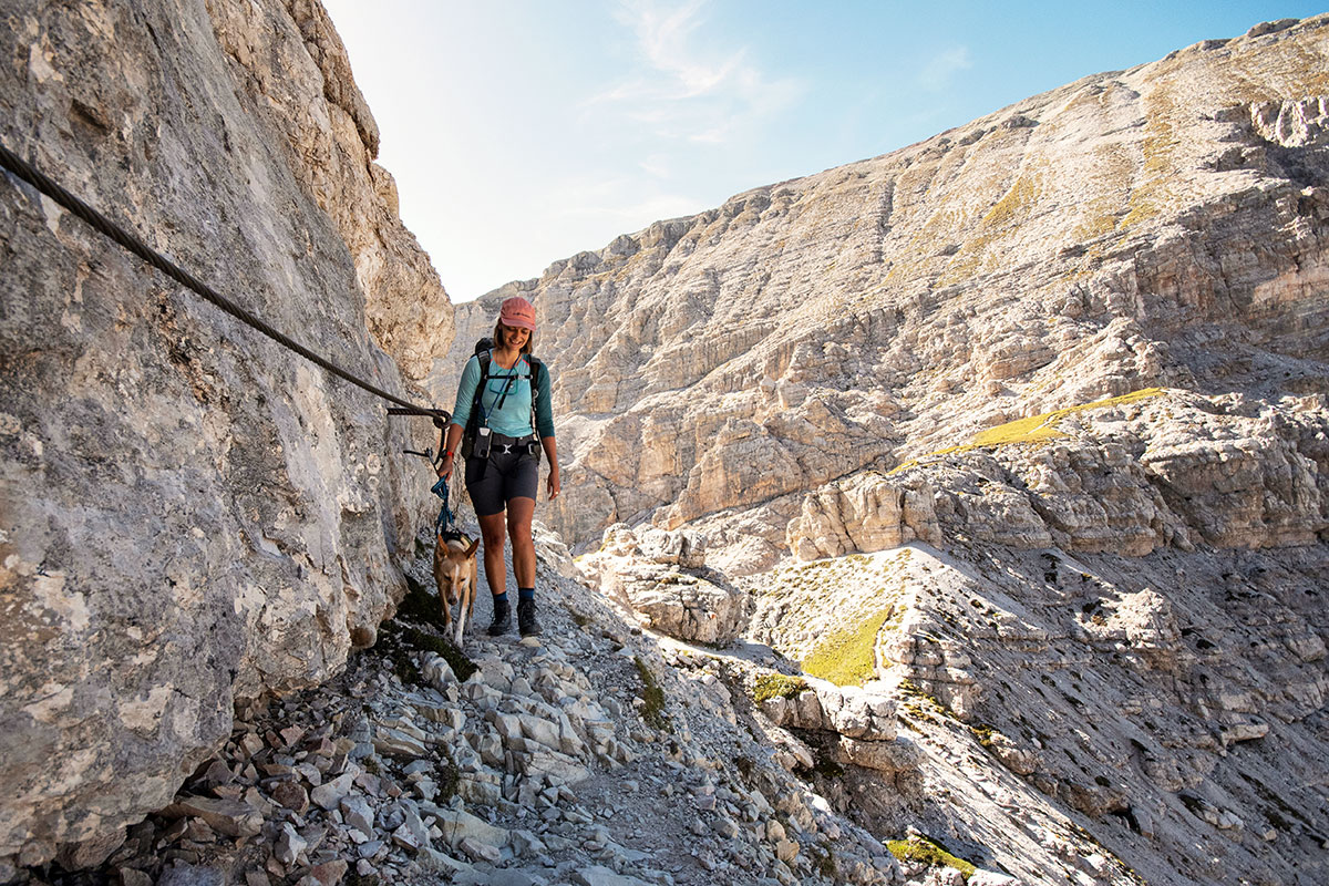 Bei der Planung ließ ich mich von bekannten Weitwanderwegen inspirieren, aber die gewählte Route war unsere ganz persönliche Linie durch die Alpen. Ich verband meine Lieblingsgebirge: Bayerische Voralpen, Karwendel, Stubaier Alpen, Dolomiten und schließlich der Gardasee. Die größte Herausforderung: alles hundetauglich zu gestalten; keine Klettersteige, keine ausgesetzten Passagen jenseits unserer Fähigkeiten. Ich habe mich an der alpinen Wanderskala des Schweizer Alpen-Clubs orientiert – mit Hund traue ich mir maximal Schwierigkeit 3 zu. Nicht jede Unterkunft erlaubt Hunde.