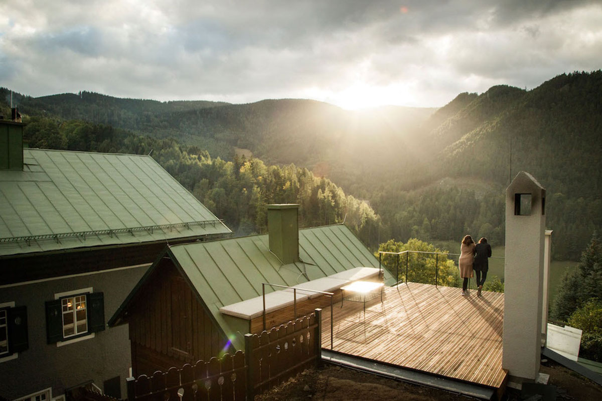 Das Jugendstil-Juwel liegt inmitten von Hügeln und Wäldern auf mehr als 1.000 Höhenmetern – an der Grenze von Niederösterreich und der Steiermark – nur einen Steinwurf vom Kurort Semmering entfernt. Wandern, Biken oder eine nostalgische Fahrt mit der Semmeringbahn über den Schwarza-Viadukt – hier oben, liegen einem alle Wege zu Füßen.