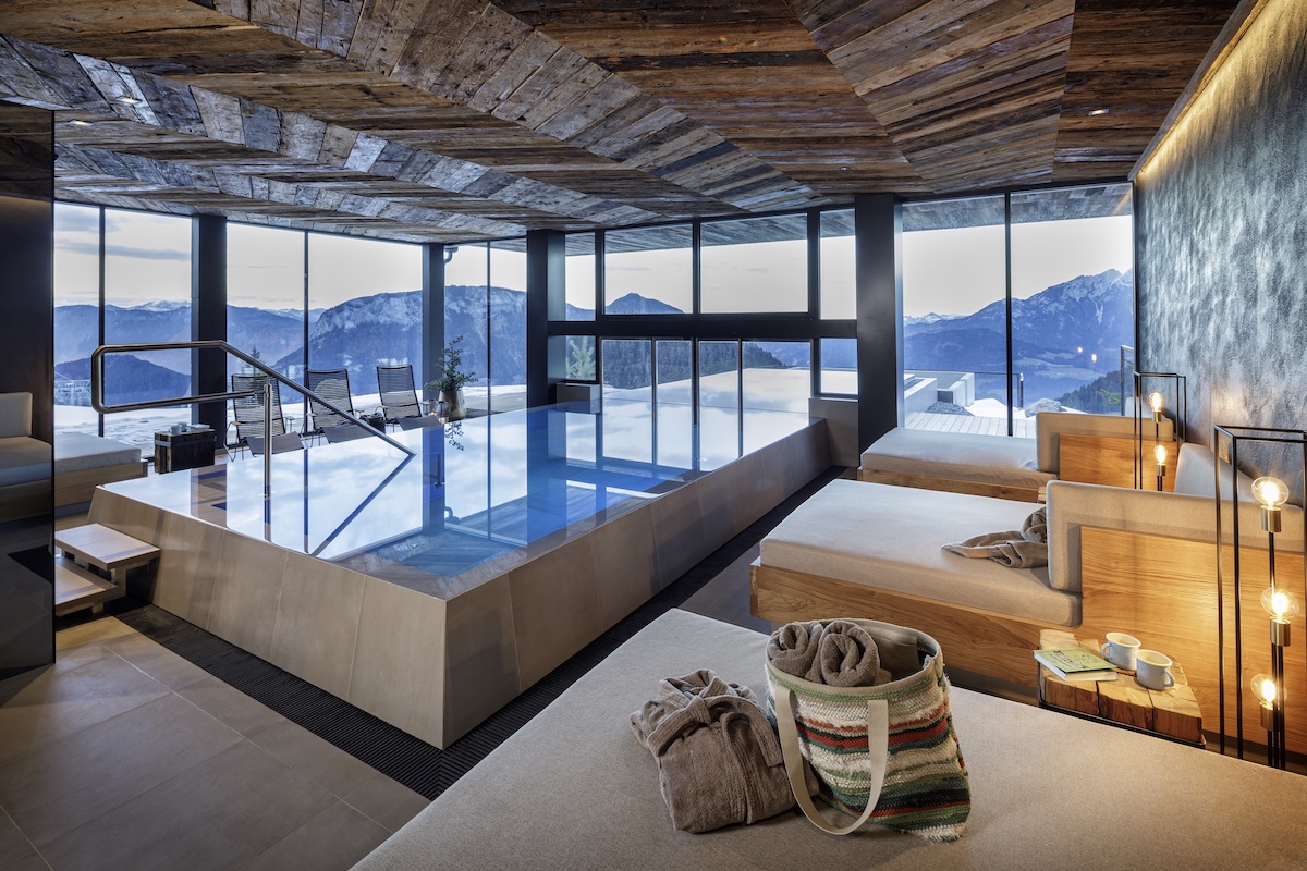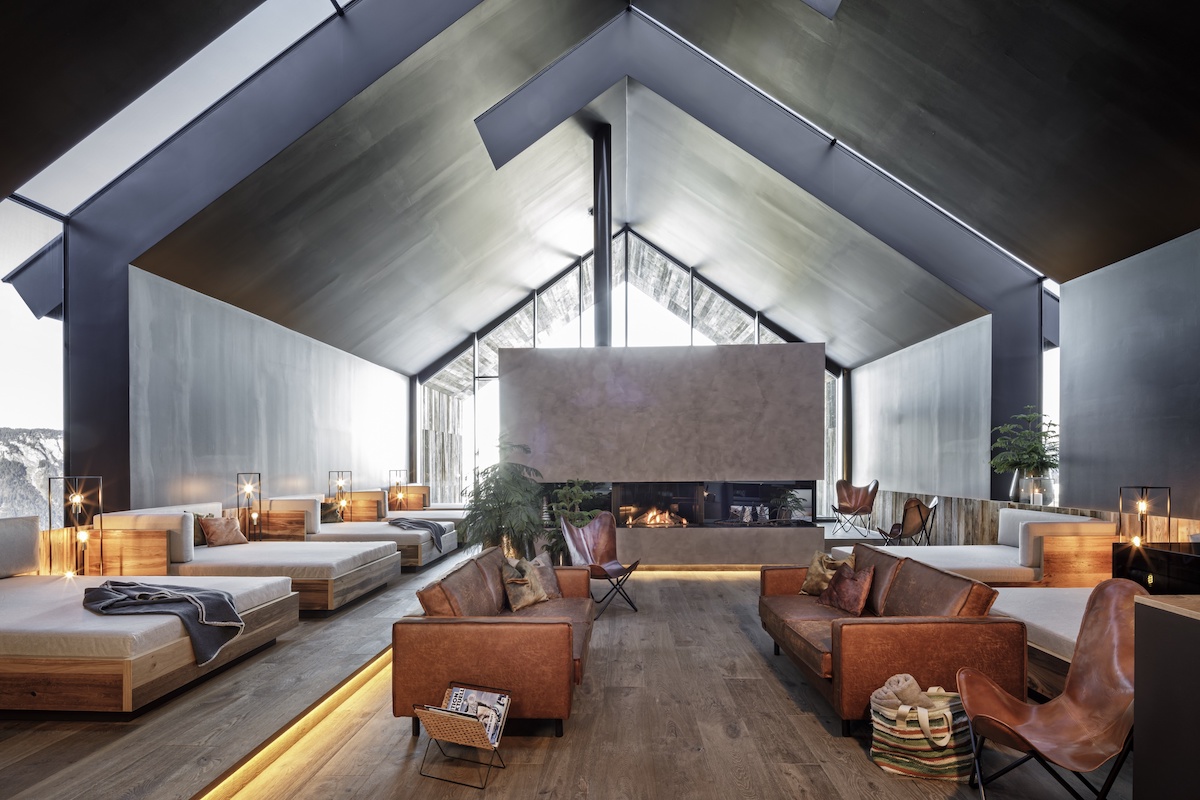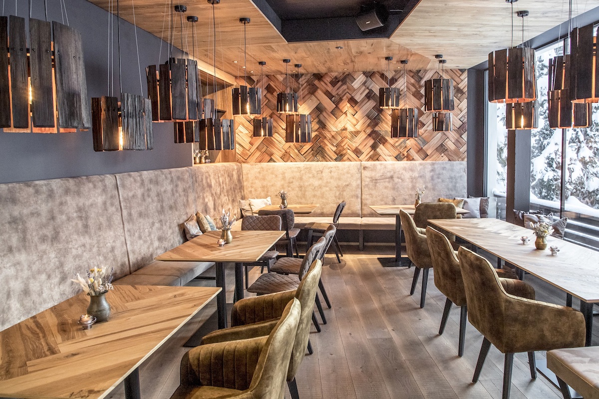 Hier ist nichts austauschbar. Marion kennt die Geschichte von beinahe jedem der Altholzbretter, die der Außenverschalung alle erdenklichen Holzfarben verleihen. Ein lebendiger Kontrast zu den geraden Formen des Hauses. Alt und Neu treffen sich hier und kommunizieren neugierig miteinander: Rauer Beton trifft auf Leinen und Holz, Naturtöne lassen viel Platz für die Bergidylle draußen, die durch große Glasflächen nach drinnen strömt.Und die große Wand aus Schindeln im Restaurant flüstert dazu Geschichten aus alten Skihütten-Tagen. Zum Frühstück gibt’s den Blick auf die Hohe Salve, zum Saunieren den auf den Wilden Kaiser. Abends blinken nach Sonnenuntergang die Lichter aus dem Tal hoch.