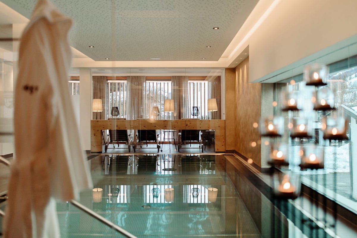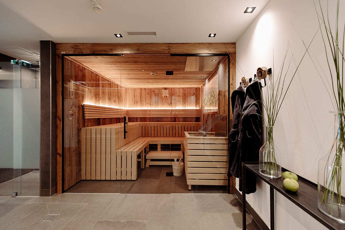 Nach einem ausgiebigen Tag in den Bergen sorgt die angenehme Wassertemperatur von 30°C für Treibenlassen-wollen im 8 Meter langen Panoramapool. Zwischen den Sauna-Gängen findet man Abkühlung in der Frischluftkammer. Die frische Bergluft tut Körper und Seele gut und belebt die Gedanken. Pure Erholung gibt es anschließend bei einer Tasse Tee oder einer individuell gebuchten Massage. Im Fitnessraum kann man sich so richtig auspowern. Immer begleitet vom Blick auf die beeindruckenden Kontraste des Hochkönigmassivs.