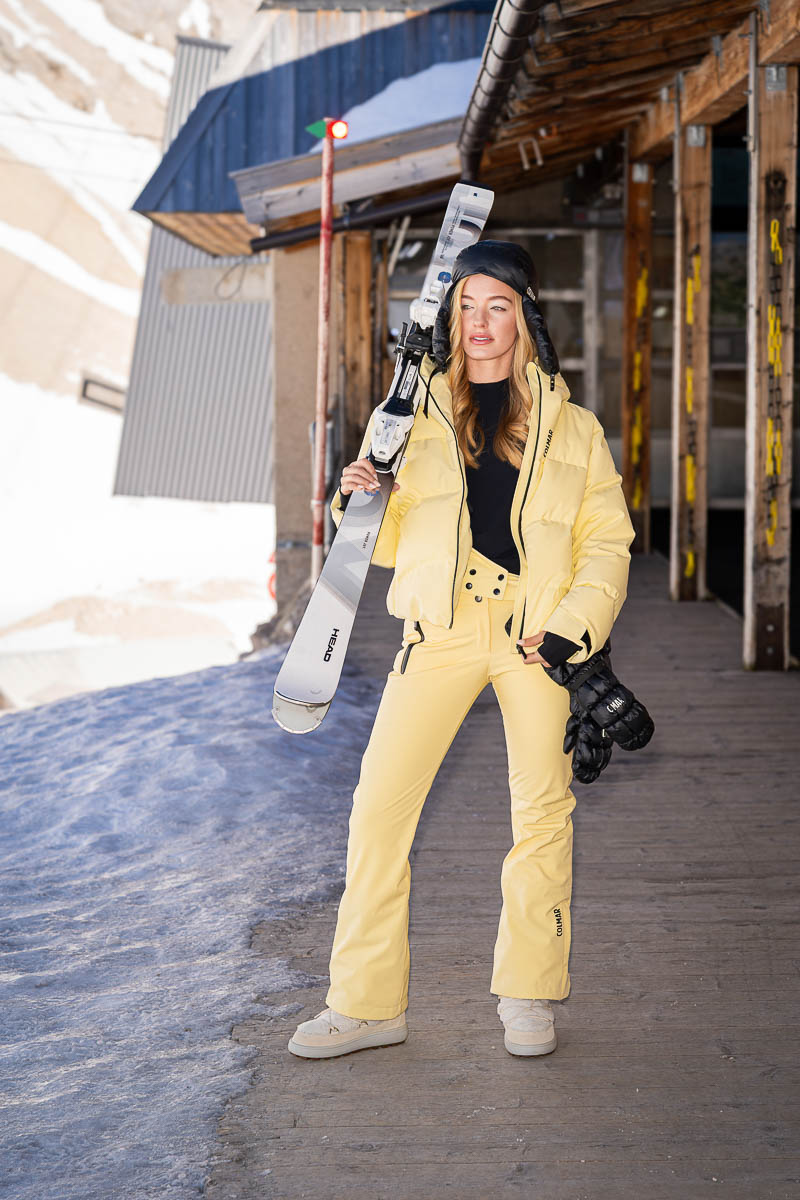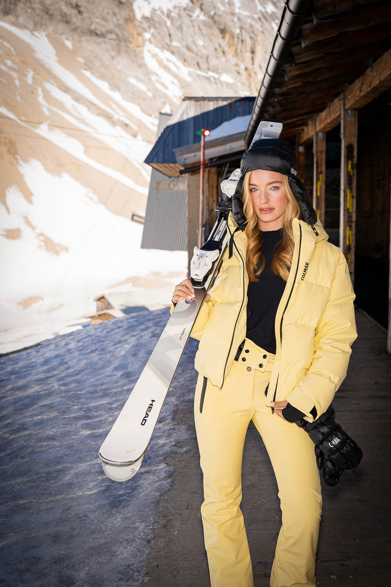 BELLA Kurze Ski-Daunenjacke (545 Euro) und Softshell-Skihose Dressy (235 Euro) in Gelb Vanilla, Unisex-Trappermütze Puffy (85 Euro), Skifäustlinge Puffy (115 Euro) von Colmar. Snow Boots Chamonix mit Spikes in Off-White von Bogner (495 Euro). Ski Power Joy (970 Euro) von Head.