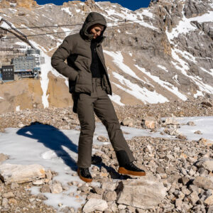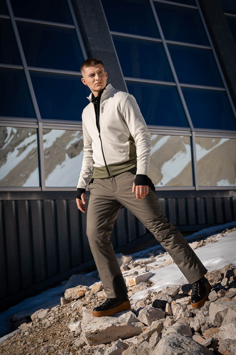 LEO Skijacke Easy On (499 Euro) und wattierte Skihose mit Trägern in Grün Woodland (299 Euro), Ski-Fleeceshirt mit Stretch und Reißverschlusskragen in Schwarz (119 Euro), Mütze (55 Euro) und Ski-Fleeceshirt mit Stretch in Purity Woodland (145 Euro) von Colmar. Mid Boots Bucharest in Schwarz von Bogner, 450 Euro.