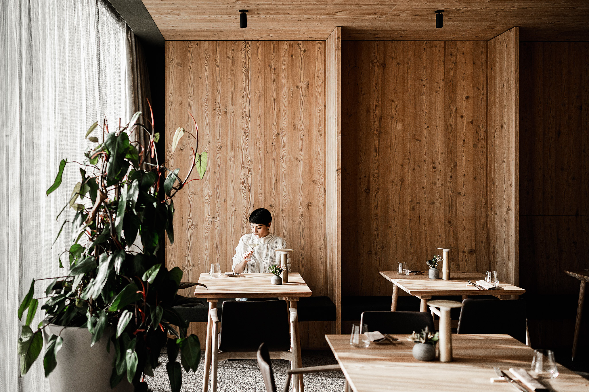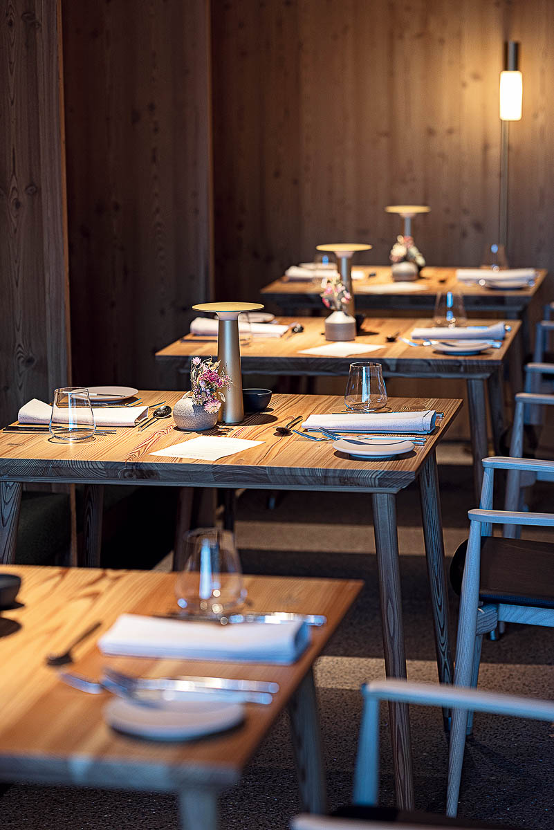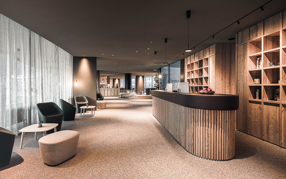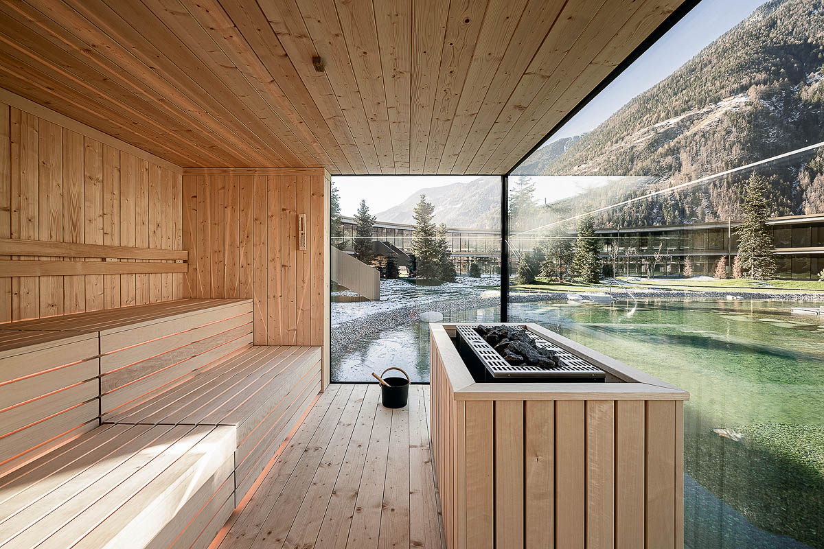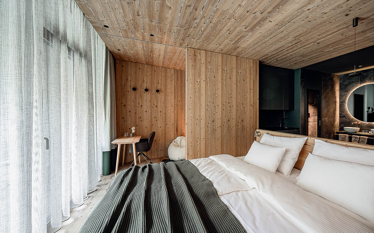 Gemeinsam mit Hotelberater Thomas Steiner hat Andreas Gruber ein Refugium entworfen, das sowohl funktional als auch ästhetisch ansprechend ist. Die 33 Apartments im Stil einer modern-urban interpretierten Südtiroler Stube sind aus warmem Lärchenholz gefertigt und bieten dank großer Glasfronten eine atemberaubende Aussicht auf die umliegende Natur. Damit alles regional bleibt, wurden die meisten Möbelstücke von einer örtlichen Tischlerei maßgefertigt. Besonders beeindruckend sind die geräumigen Apart-Suiten mit eigener Sauna, freistehender Badewanne und ebenfalls herrlichem Panoramablick.